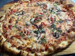 Black olives, mushrooms, green peppers, white onions, roasted red peppers, mozzarella, fresh basil.