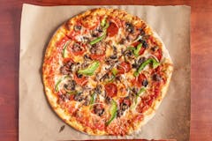 Pepperoni, sausage, hamburger, green peppers, onions, mushrooms.